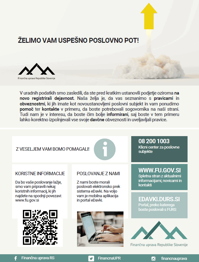 Namen obiska je, da jih seznanijo s pravicami in obveznostmi, ki jih imajo kot novoustanovljeni poslovni subjekt in jim ponudijo pomoč ter kontakte v primeru, da bodo potrebovali sogovornika na njihovi strani. "Želimo si namreč, da so davčni zavezanci čim bolje informirani in pripravljeni na izzive, s katerimi se bodo srečali na davčnem in carinskem področju," so sporočili iz Fursa.