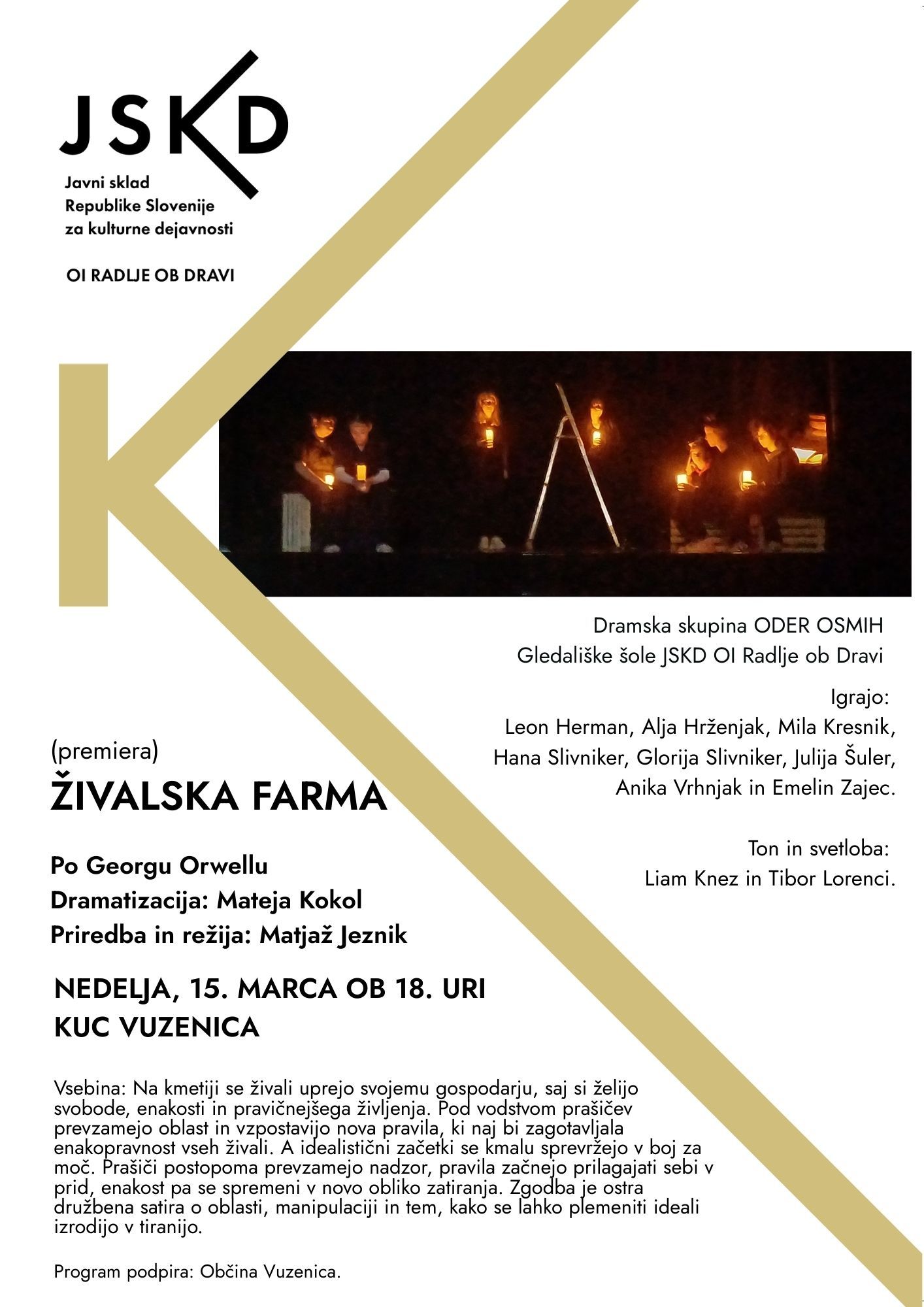 Tokrat bo zaživela v obliki gledališke predstave, v izvedbi dramske skupina Oder OSMIH gledališke šole JSKD OI Radlje ob Dravi. Ob podpori Občine Vuzenica vabi na premiero predstave Živalska farma v nedeljo, 15. marca 2026, ob 18. uri, v dvorano Kulturno upravnega centra Vuzenica.