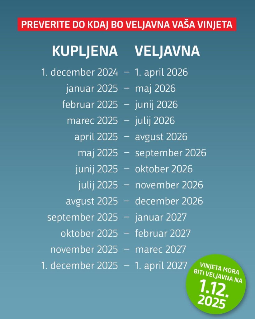 Če pa bo letna vinjeta kupljena ali bo njena veljavnost začela teči 2. decembra 2025 ali kasneje, bo veljala klasičnih 12 mesecev od izbranega datuma začetka veljavnosti, dodajajo.