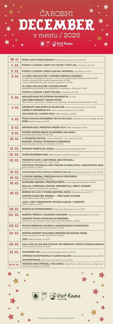 Praznično dogajanje na Ravnah na Koroškem se je že pričelo s slavnostnim prižigom lučk in parkljevanjem. Na mestnem platoju se je zbrala velika množica, ki je skupaj s predstavniki Občine in ZKŠTM Ravne odštevala do prižiga lučk. S tem so se tudi uradno začeli dogodki Čarobnega decembra v mestu, ki bodo v prvem tednu namenjeni predvsem otrokom.