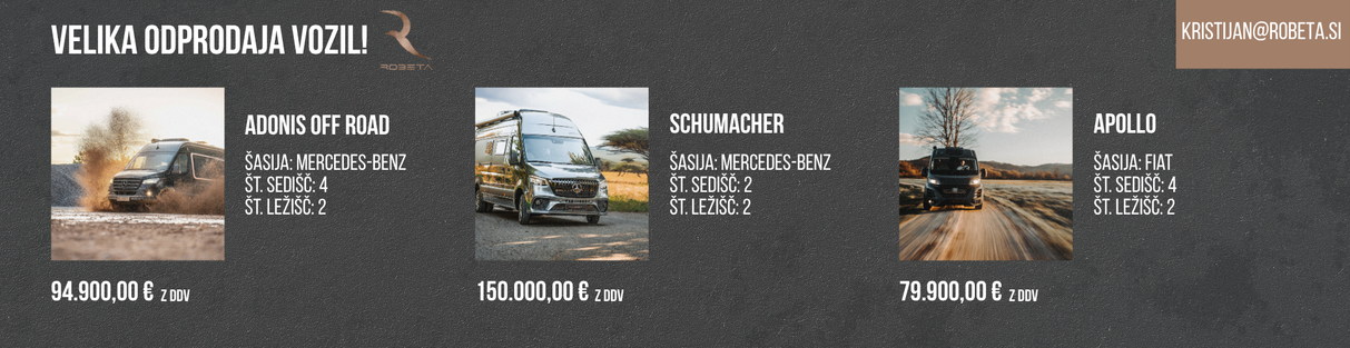 Za kupce, ki si želijo avtodom višjega razreda po bistveno ugodnejši ceni, je to ena redkih priložnosti, saj so omenjeni Robetini modeli zaradi svoje kakovosti praviloma hitro razprodani, medtem ko je pri novih vozilih čakalna doba lahko daljša. Odprodaja sejemskih in demo avtov tako predstavlja idealno možnost za vse, ki bi radi na pot že to sezono, ne da bi sklepali kompromis pri opremi ali udobju.