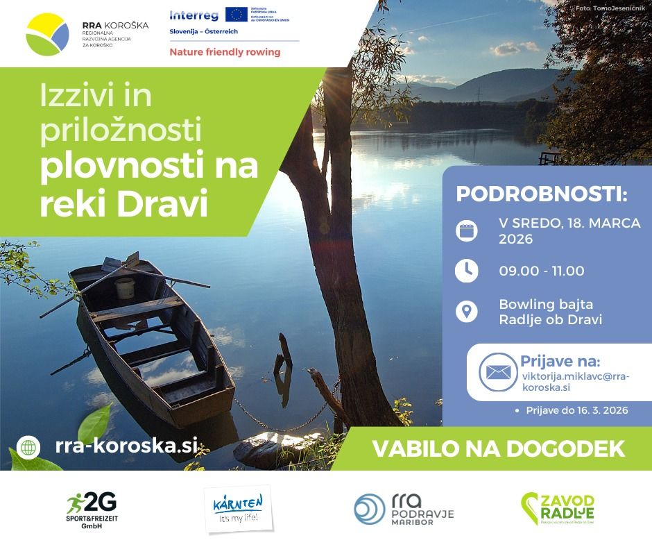 Dogodek, ki bo potekal v sredo, 18. marca 2026, ob 9. uri v Bowling bajti Radlje ob Dravi (Dobrava 49, 2360 Radlje ob Dravi), je namenjen predstavitvi čezmejnega pristopa k razvoju trajnostnega turističnega produkta na reki Dravi ter razpravi o vzpostavljanju pogojev za trajnostno in naravi prijazno rabo reke za izvajanje športno-rekreativnih aktivnosti.