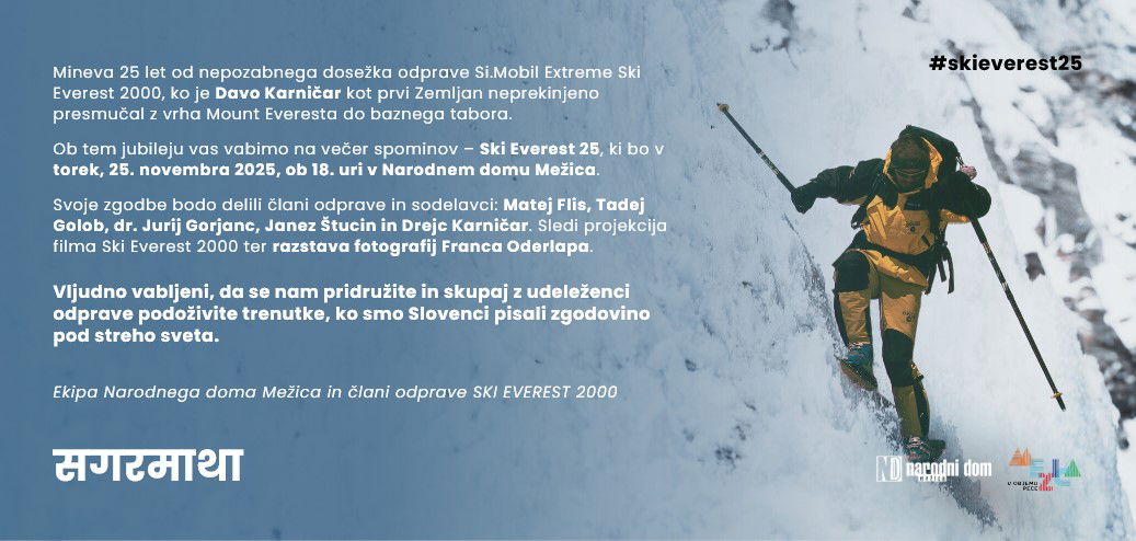 Ob tej pomembni obletnici vas ekipa Narodnega doma Mežica in člani odprave Ski Everest 2000 vabijo, da se jim pridružite na posebnem dogodku Ski Everest 25, ki bo potekal v torek, 25. novembra 2025, ob 18. uri, v Narodnem domu Mežica.