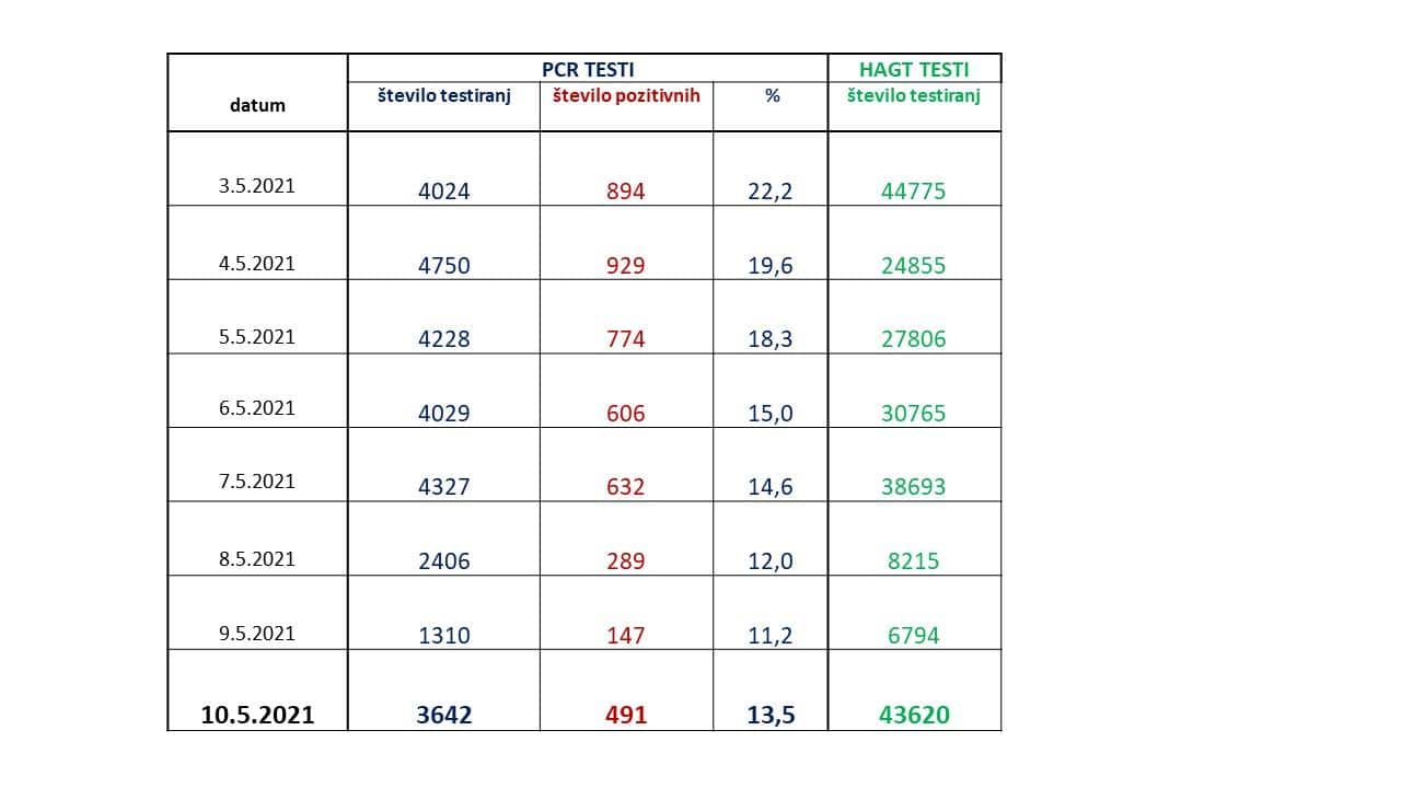 Včeraj je bilo ob opravljenih 3.642 PCR testih potrjenih 491 novih okužb. Opravljenih je bilo tudi 43.620 hitrih antigenskih testov.