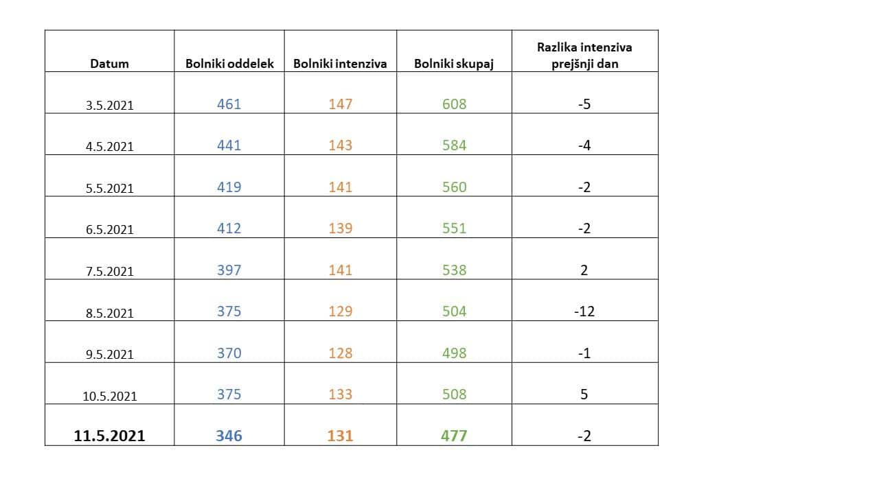 Včeraj je bilo v bolnišnice sprejetih 26 pacientov, iz bolnišnic pa je bilo skupaj odpuščenih 54 pacientov. Kot že rečeno se skupaj v bolnišnicah zdravi 477 obolelih za COVID, od tega 131 na oddelkih intenzivne terapije. V bolnišnicah so včeraj žal umrle 3 osebe, je na novinarski konferenci o aktualnem stanju glede bolezni Covid-19 navedla vladna govorka Maja Bratuša.