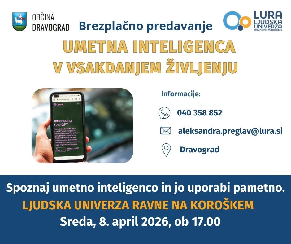 Ljudska univerza Ravne v sodelovanju z Občino Dravograd pripravlja predavanje, na katerem boste spoznali osnove umetne inteligence in njene praktične možnosti uporabe v vsakdanjem življenju.