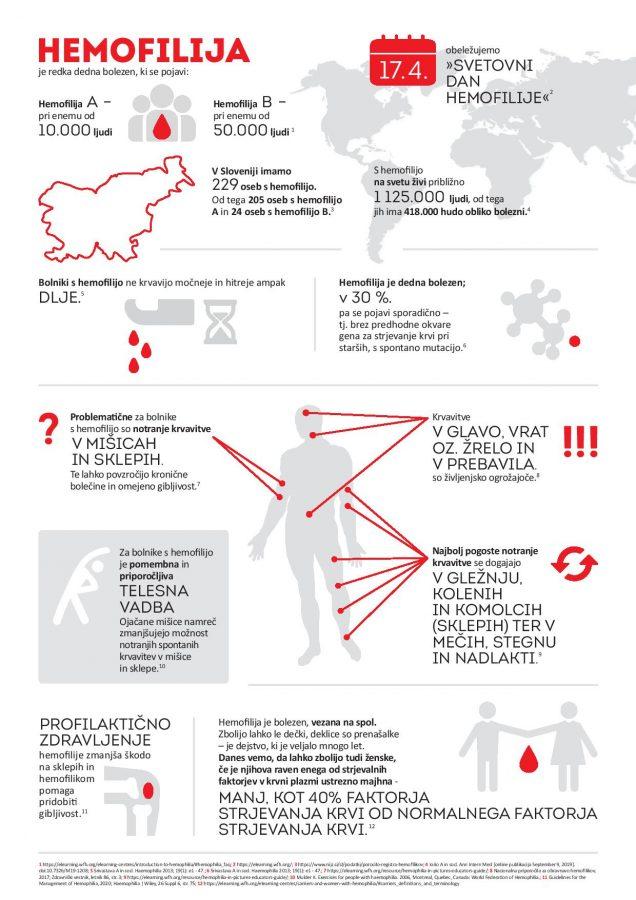Hemofilija se namreč pojavi pri enemu od 10 tisoč ljudi (hemofilija A) in pri enemu od 50 tisoč ljudi (hemofilija B). V Sloveniji je po uradnih podatkih oseb s hemofilijo A 205, oseb s hemofilijo B pa 24. Je redka, a dedna bolezen z motnjo strjevanja krvi, pri kateri osebe ne krvavijo močneje in hitreje, ampak dlje. Po svetu živi s hudo obliko bolezni 418 tisoč oseb, skupno je okrog 1.125.000 oseb s hemofilijo. Dobijo jo z dedovanjem, v 30 % pa se pojavi sporadično, tj. s spontano mutacijo in brez predhodne okvare gena za strjevanje krvi pri starših.