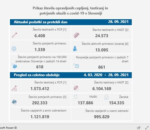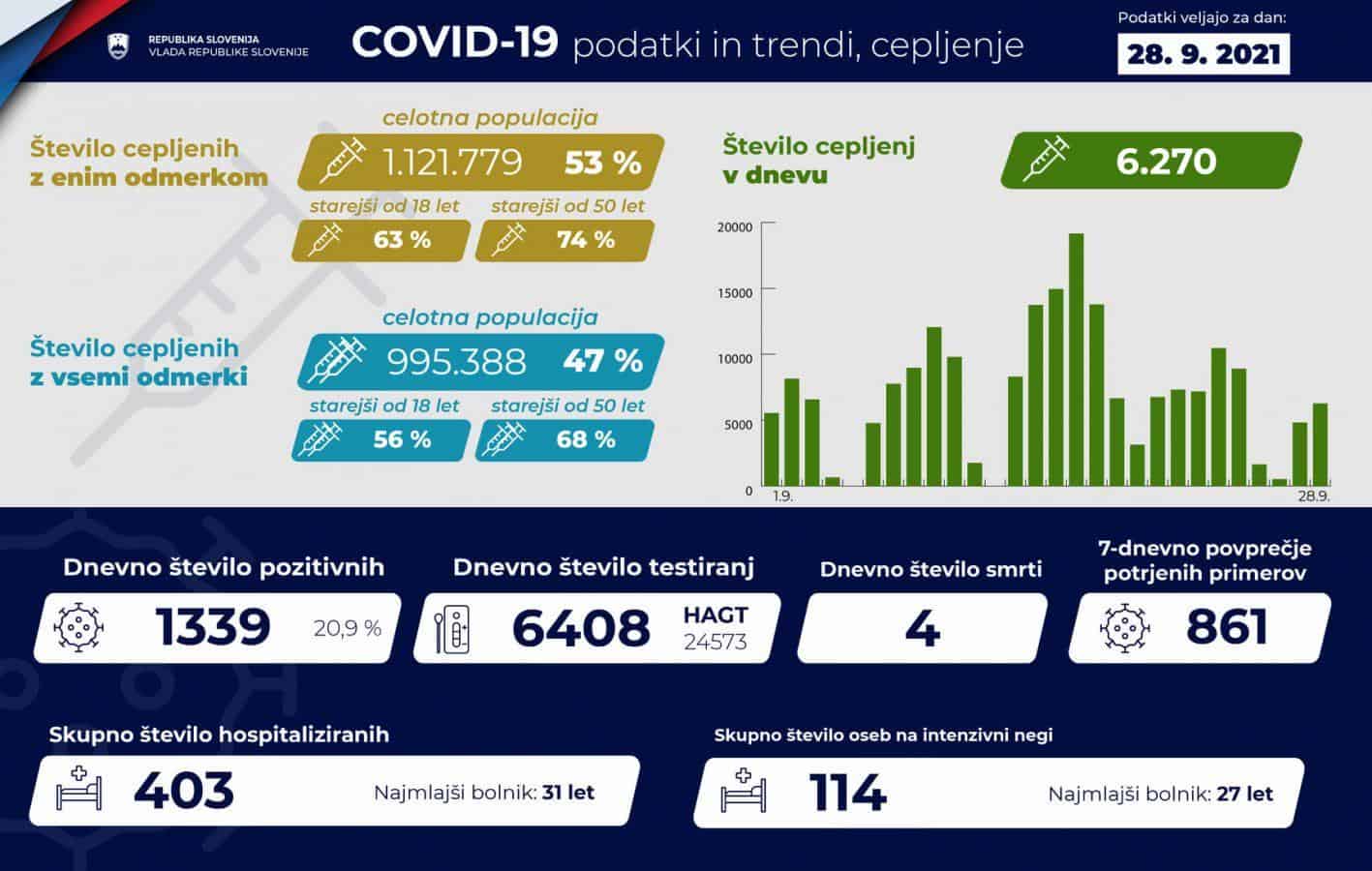 V torek so v Sloveniji ob opravljenih 6.408 PCR testih potrdili 1.339 okužb z novim koronavirusom (dan pred tem ob 4.785 PCR testih 1.031 okužb). Pozitivnih je bilo 20,9 odstotka opravljenih PCR testov (dan pred tem 21,5 odstotka).