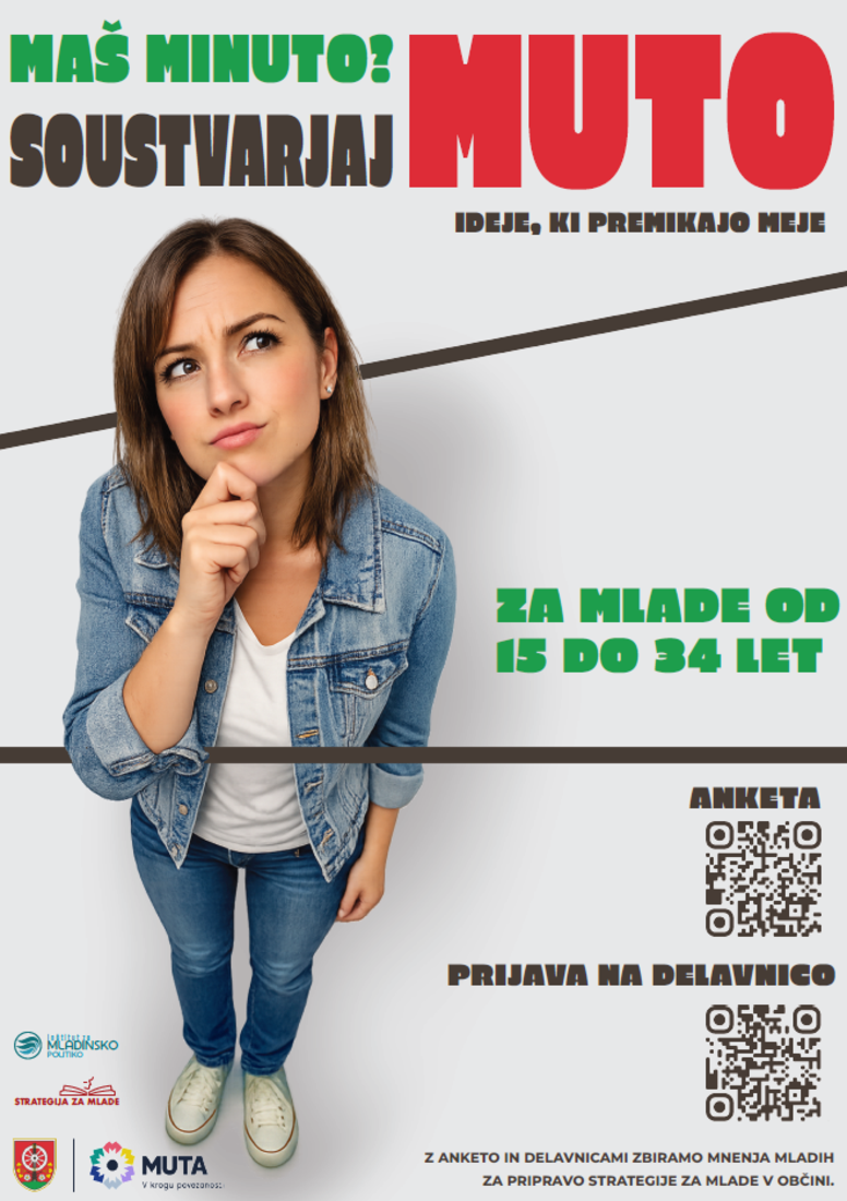 Občina Muta skupaj z Inštitutom za mladinsko politiko pripravlja delavnico za mlade od 15. do 34. leta, na kateri bodo imeli priložnost izraziti svoje mnenje, saj se zavedajo, da mnenje mladih še kako šteje. S sloganom ''Imaš minuto? Soustvarjaj Muto'', želijo spodbuditi mlade, da s svojimi idejami pripomorejo k razvoju in oblikovanju Mute, po meri vseh občanov.