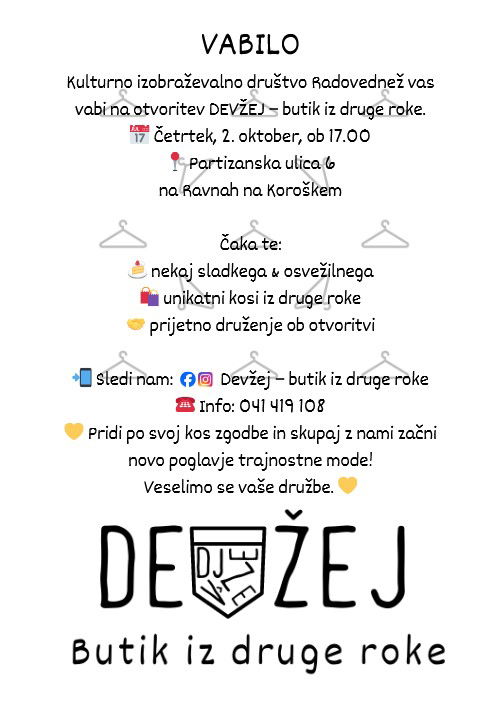 Kulturno izobraževalno društvo Radovednež vas v četrtek, 2. oktobra 2025, ob 17.00, vabi na otrovitev second-hand trgovine z rabljenimi oblačili Devžej – butik iz druge roke. Butik boste našli na Partizanski cesti 6 na Ravnah.