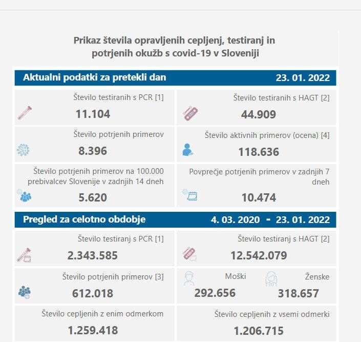 Po oceni NIJZ je v Sloveniji 118.636 aktivnih okužb, dan pred tem 112.517. Sedemdnevno povprečje znaša 10.474, dan pred tem 9950, 14-dnevno povprečje na 100.000 prebivalcev pa 5620, dan ped tem 5329.