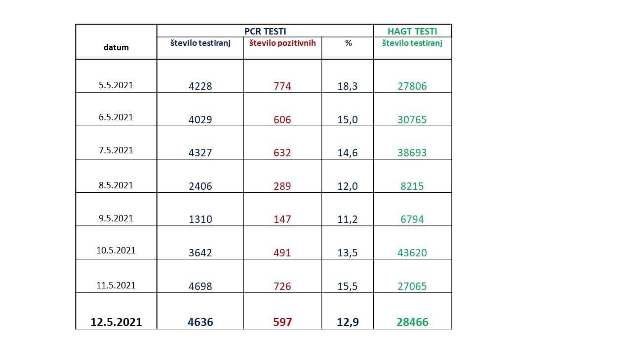 Včeraj je bilo opravljenih 4.636 PCR testiranj in 28.466 hitrih antigenskih testov. S PCR testi je bilo včeraj potrjenih 597 novih okužb. 7-dnevno povprečje okužb se je še nekoliko znižalo in trenutno znaša 494.