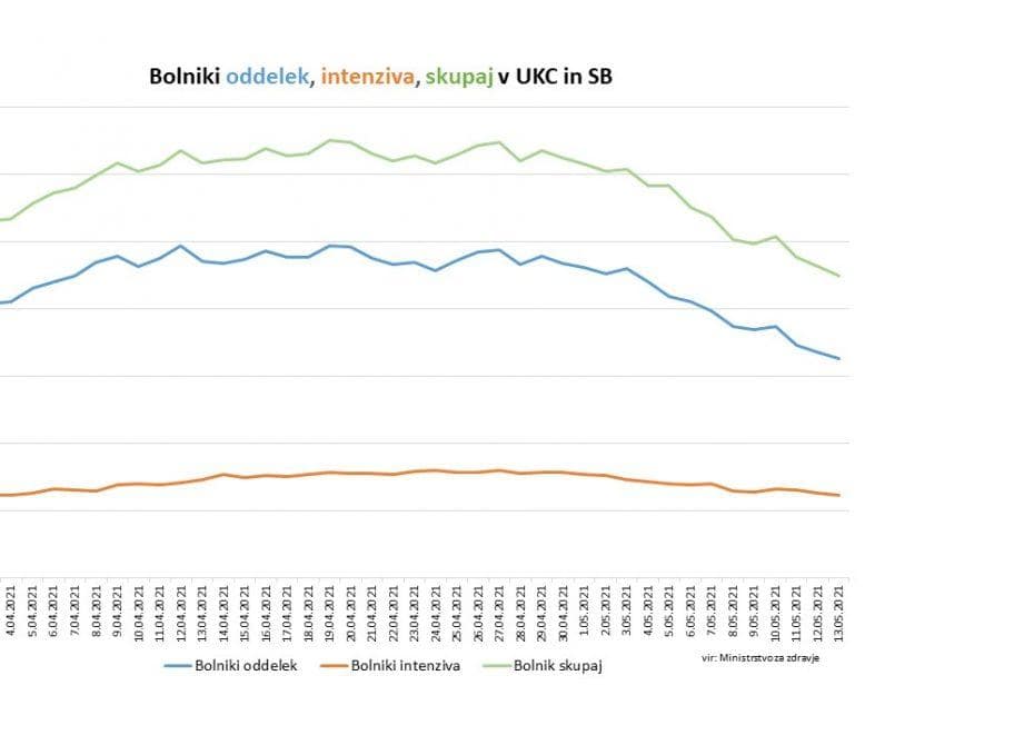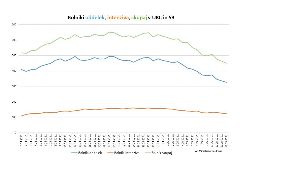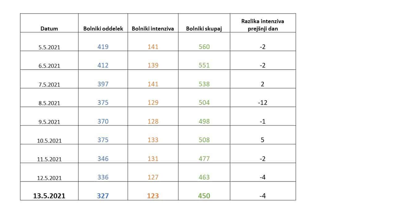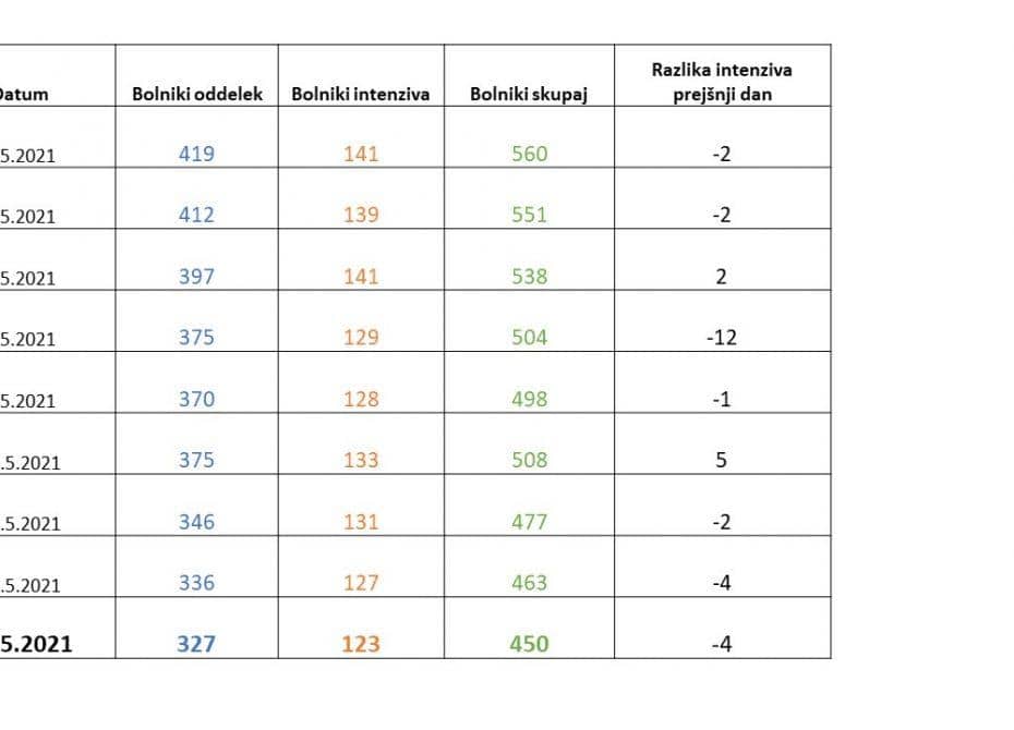 Skupaj se danes v naših bolnišnicah zdravi 450 covid pacientov, od tega 123 na intenzivni terapiji. Na novo je bilo včeraj v bolnišnice sprejetih 36 oseb, odpuščenih pa 45 covid pacientov. Umrle so 4 osebe.