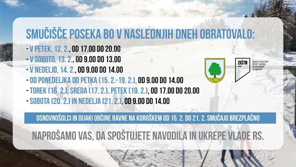 Pri tem naj spomnimo, da bo od ponedeljka na smučiščih veljal nov odlok, ki med drugim določa, da bo za uporabo žičniških naprav veljal negativni test na novi koronavirus, ki ni starejši od sedmih dni. Doslej so se morali smučarji testirati na 24 ur. Uporaba se dovoli tudi otrokom do vključno 12. leta starosti v spremstvu staršev.