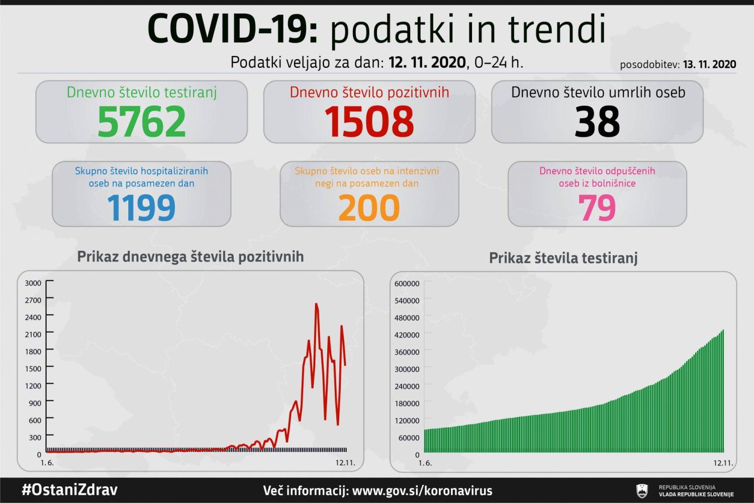 Trend obolelosti s koronavirusom v Sloveniji na dan 12. 11. 2020 (00:00-24:00):