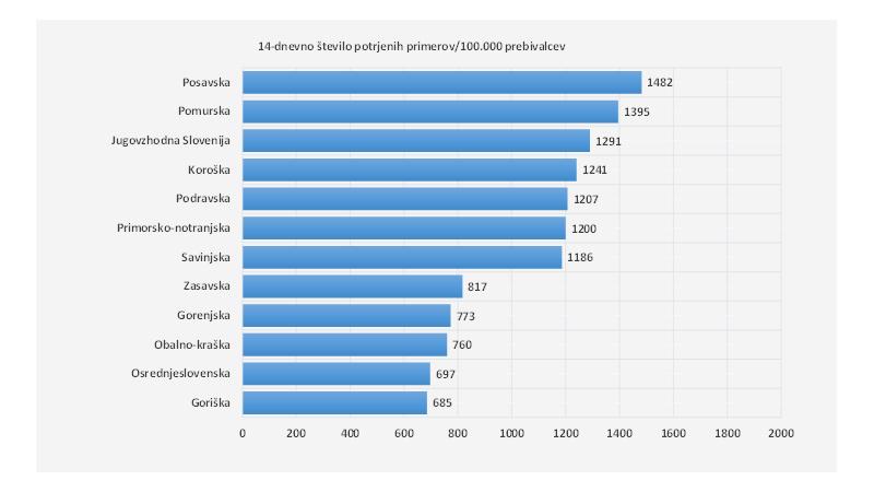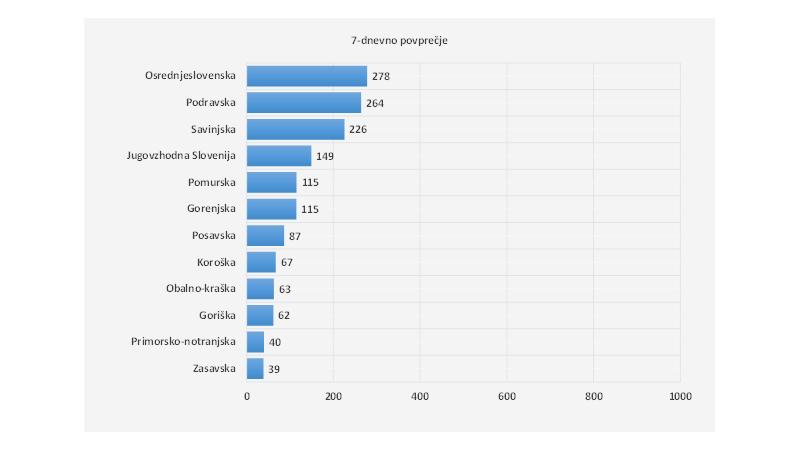 7-dnevno povprečje števila potrjenih primerov nam kaže, da je bilo v povprečju največ novih primerov v Osrednjeslovenski regiji, najmanj pa v Zasavski.