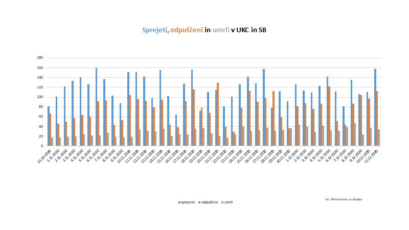 Včeraj je bilo v bolnišnice skupaj sprejetih 157 Covidnih pacientov. Iz bolnišnic je bilo skupaj odpuščenih 113 pacientov. Skupaj je včeraj bolnišnično oskrbo potrebovalo 1268 Covidnih pacientov, 10 več kot v sredo.