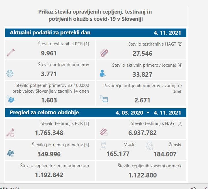 V četrtek so v Sloveniji opravili 9961 PCR-testov in z njimi potrdili 3771 okužb z novim koronavirusom, dan pred tem so v državi opravili 10.156 PCR-testov in z njimi potrdili 4511 okužb. Pozitivnih je bilo 37,9 odstotka opravljenih testov, dan pred tem 44,4.