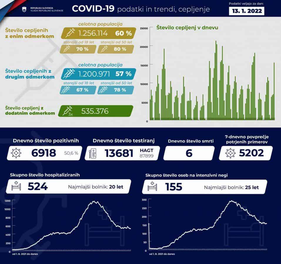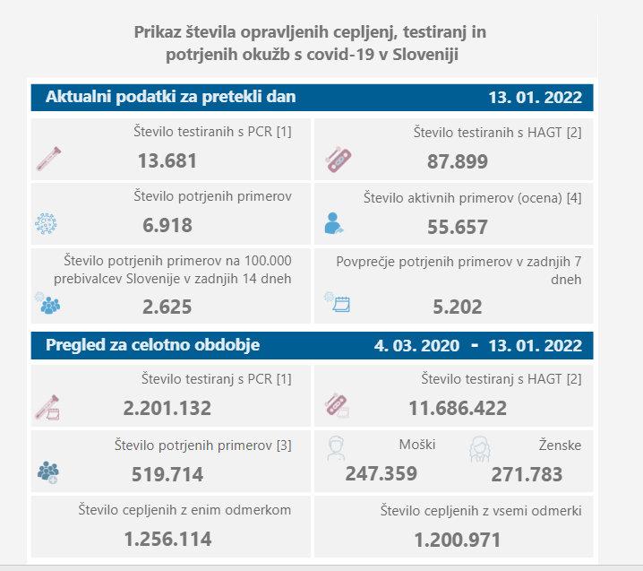 V četrtek so v Sloveniji ob opravljenih 13.681 PCR-testih potrdili 6918 okužb z novim koronavirusom, dan pred tem so ob opravljenih 13.335 PCR-testih potrdili 6855 okužb. Delež pozitivnih PCR-testov je znašal 50,6 odstotka, dan pred tem je bil 51,4-odstoten. Opravili so tudi 87.899 hitrih testov, katerih pozitivne rezultate preverjajo še s PCR-testi, dan pred tem 98.585 .