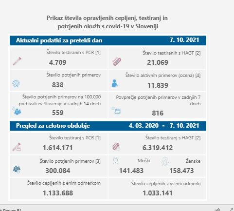 V četrtek so v Sloveniji opravili 4.709 PCR testov in z njimi potrdili 838 okužb z novim koronavirusom, dan pred tem so ob 5.336 PCR testih potrdili 968 novih okužb. Delež pozitivnih PCR testov je znašal 17,8 odstotka, dan pred tem 18,1 odstotka. Včeraj so sicer v državi opravili tudi 21.069 hitrih testov, ki jih v primeru pozitivnega izvida preverijo še s PCR-testi. Dan pred tem 23.853.