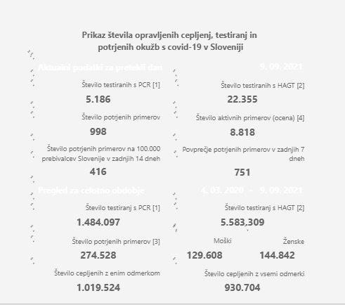 V četrtek so v Sloveniji ob opravljenih 5.186 PCR testih potrdili 998 okužb (dan pred tem ob 4.912 PCR testih 1.016). Pozitivnih je bilo 19,2 odstotka opravljenih PCR testov (dan pred tem 20,7 odstotka).