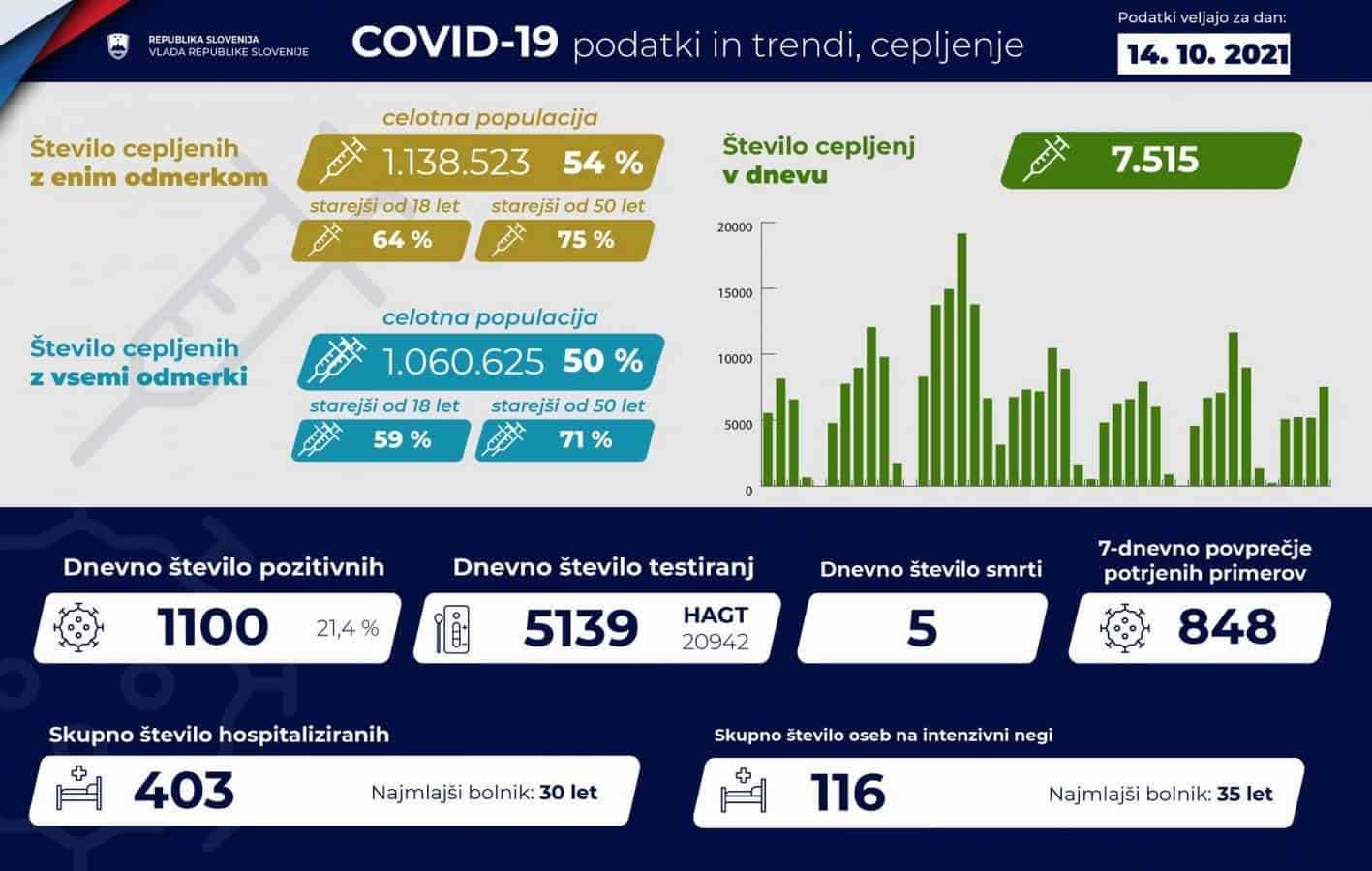 V četrtek so v Sloveniji opravili 5.139 PCR testov in z njimi potrdili 1.100 okužb z novim koronavirusom, dan pred tem so ob 5.366 PCR testih potrdili 1.081 novih okužb. Delež pozitivnih PCR testov je znašal 21,4 odstotka, dan pred tem 20,1 odstotka. Včeraj so sicer v državi opravili tudi 20.942 hitrih testov, ki jih v primeru pozitivnega izvida preverijo še s PCR-testi. Dan pred tem 23.586.