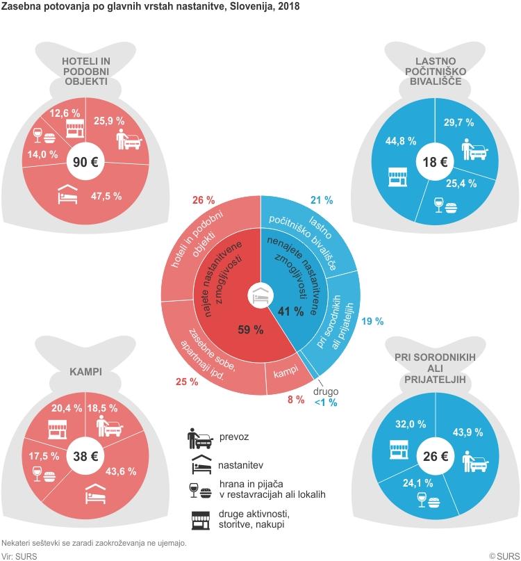 Zasebno potovanje prebivalcev Slovenije je v 2018 trajalo povprečno 4,5 prenočitve (v Sloveniji 2,7 prenočitve, v tujini 5,8 prenočitve). Povprečni dnevni izdatki na takih potovanjih so znašali okoli 50 EUR na turista (v Sloveniji 40 EUR, v tujini 53 EUR). Turist, ki je bival v hotelu ali podobnem objektu, je porabil povprečno največ denarja na dan (90 EUR); v Sloveniji 67 EUR, v tujini 100 EUR), turist, ki je bival v lastnem počitniškem bivališču, pa povprečno najmanj (18 EUR); v Sloveniji 18 EUR, v tujini 19 EUR).