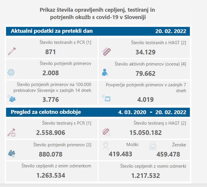 Po oceni Nacionalnega inštituta za javno zdravje (NIJZ) je v državi trenutno 79.662 primerov aktivnih okužb, dan prej 83.177. Sedemdnevno povprečje potrjenih primerov trenutno znaša 4019, dan prej 4248. Tudi število potrjenih primerov v zadnjih 14 dneh na 100.000 prebivalcev je nadalje upadlo in trenutno znaša 3776, dan prej pa 3942.