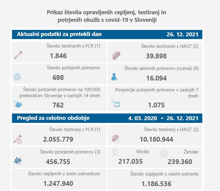 V nedeljo so v Sloveniji ob 1846 PCR-testih potrdili 698 okužb z novim koronavirusom, dan pred tem so ob 2157 PCR-testih potrdili 666 okužb. Delež pozitivnih PCR-testov znaša 37,8 odstotka dan pred tem 30,9 odstotka. Opravili so tudi 39.898 hitrih antigenskih testov, katerih pozitivne rezultate potrjujejo še s PCR-testiranjem, dan pred tem 12.951.