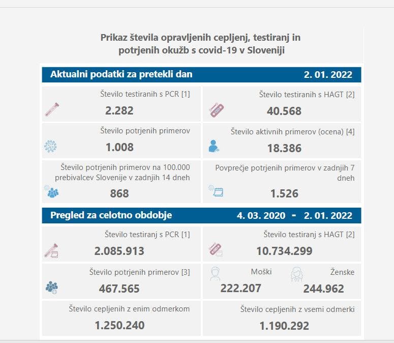 V nedeljo so v Sloveniji ob 2282 PCR-testih potrdili 1008 okužb z novim koronavirusom, dan pred tem so ob 1981 PCR-testih potrdili 829 okužb. Delež pozitivnih PCR-testov znaša 44,2 odstotka, dan pred tem 41,8 odstotka. Opravili so tudi 40.568 hitrih antigenskih testov, katerih pozitivne rezultate potrjujejo še s PCR-testiranjem, dan pred tem 11.133.