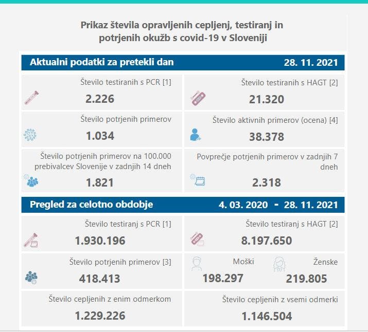 V nedeljo so v Sloveniji ob 2226 PCR-testih potrdili 1034 okužb z novim koronavirusom, dan pred tem so ob 3402 PCR-testih potrdili 1478 okužb. Delež pozitivnih PCR-testov znaša 46,5 odstotka, dan pred tem 43,4 odstotka. Opravili so tudi 21.320 hitrih antigenskih testov, katerih pozitivne rezultate potrjujejo še s PCR-testiranjem, dan pred tem 47.221.