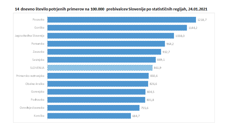 14 dnevna incidenca ostaja najvišja v Posavski, Goriški in Jugovzhodni, 7 dnevna pa v Goriški, Posavski in Zasavski. Najnižja na Koroškem.