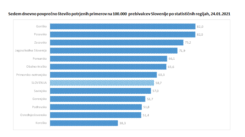 Podatki NIJZ o sedemdnevnem povprečnem številu potrjenih novih okužb na 100.000 prebivalcev Slovenije po statističnih regijah govorijo, da so razmere najslabše v Goriški, Posavski in Zasavski regiji. Najboljše pa na Koroškem.