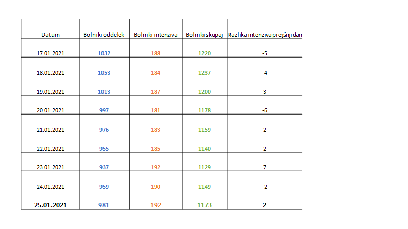Včeraj je bilo v bolnišnice sprejetih 73 pacientov, v soboto še nekoliko več in sicer 86. Skupaj je bilo iz bolnišnic včeraj odpuščenih 33 pacientov, v soboto pa 36. Na intenzivni negi se je včeraj zdravilo 192 COVID-19, 2 pacienta več kot v soboto. Jutranji podatki kažejo, da se v bolnišnicah zaradi koronavirusa zdravi 1.173 pacientov.
