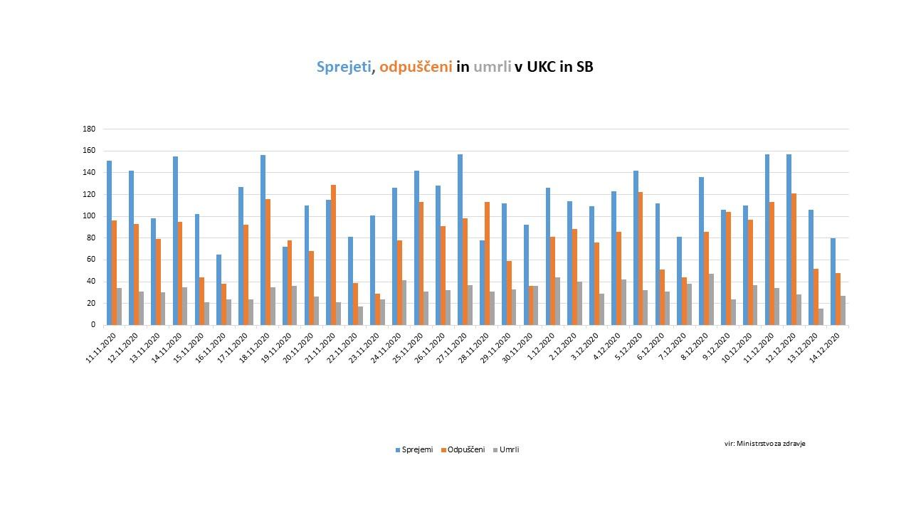 Včeraj je bilo v bolnišnice sprejetih 80 novih pacientov, odpuščenih pa 48 covidnih pacientov. V soboto je bilo odpuščenih 52, kar pomeni, da je bilo čez vikend odpusta skupaj 100. Skupaj je sicer bolnišnično oskrbo v nedeljo potrebovalo 1320 pacientov, intenzivno nego pa 208, je še pojasnil Kacin.