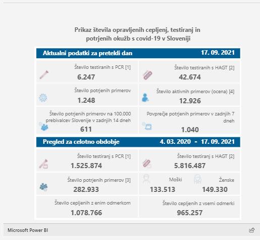 Pred tednom dni so v Sloveniji ob opravljenih 5.488 PCR testih potrdili 1.085 okužb z novim koronavirusom. Delež pozitivnih je znašal 19,8 odstotka. V bolnišnicah so zdravili 274 bolnikov s potrjeno okužbo, 62 jih je potrebovalo intenzivno zdravljenje.