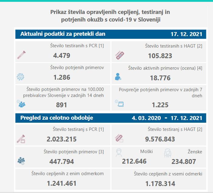 V petek so v Sloveniji ob 4479 PCR-testih potrdili 1286 okužb z novim koronavirusom, dan pred tem so ob 5022 PCR-testih potrdili 1278 okužb. Delež pozitivnih PCR-testov znaša 28,7 odstotka, dan pred tem 25,4 odstotka. Opravili so tudi 105.823 hitrih antigenskih testov, katerih pozitivne rezultate potrjujejo še s PCR-testiranjem, dan pred tem 76.794.