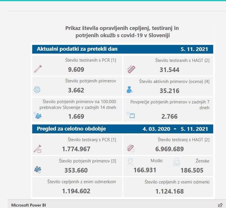 Po oceni NIJZ je v državi 35.216 aktivnih primerov okužbe, dan pred tem 33.827. Sedemdnevno povprečje potrjenih primerov se je dvignilo na 2766, dan pred tem je znašalo 2671. Štirinajstdnevno povprečje potrjenih okužb na 100.000 prebivalcev pa je 1669, dan pred tem 1603.
