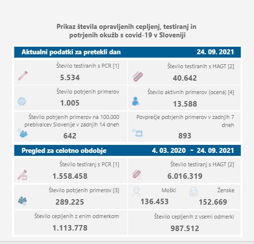 V petek so v Sloveniji ob opravljenih 5.534 PCR testih potrdili 1.005 okužb z novim koronavirusom (dan pred tem ob 5.471 PCR testih 941 okužb). Pozitivnih je bilo 18,2 odstotka opravljenih PCR testov (dan pred tem 17,2 odstotka).