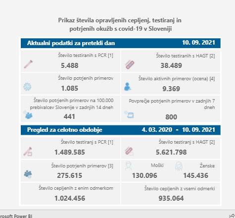 V slovenskih bolnišnicah zdravijo 274 covidnih bolnikov (dan pred tem 278), od teh jih potrebuje intenzivno zdravljenje 62, dan pred tem 61.