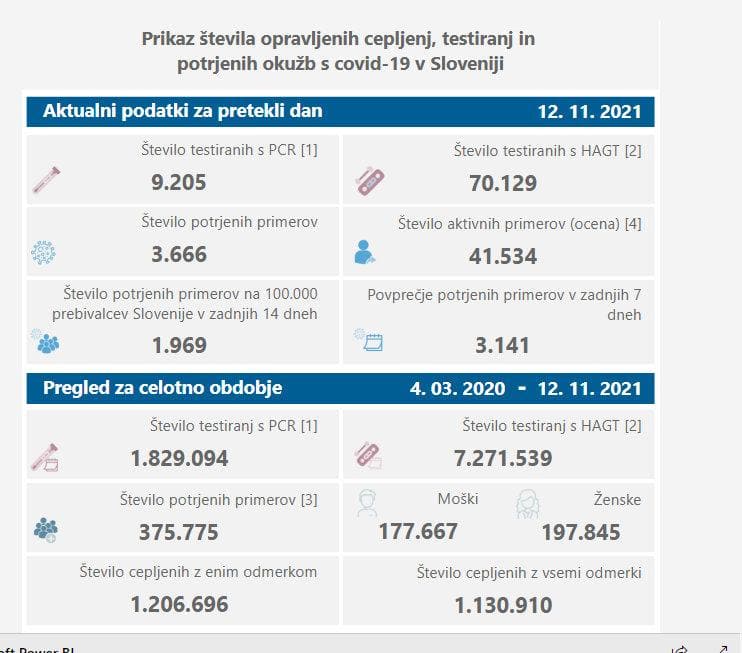 V petek so v Sloveniji ob 9205 PCR-testih potrdili 3666 okužb z novim koronavirusom, dan pred tem so ob 9118 PCR-testih potrdili 3431 okužb. Delež pozitivnih PCR-testov znaša 39,8 odstotka, dan pred tem 37,6 odstotka. Opravili so tudi 70.129 hitrih antigenskih testov, katerih pozitivne rezultate potrjujejo še s PCR-testiranjem.