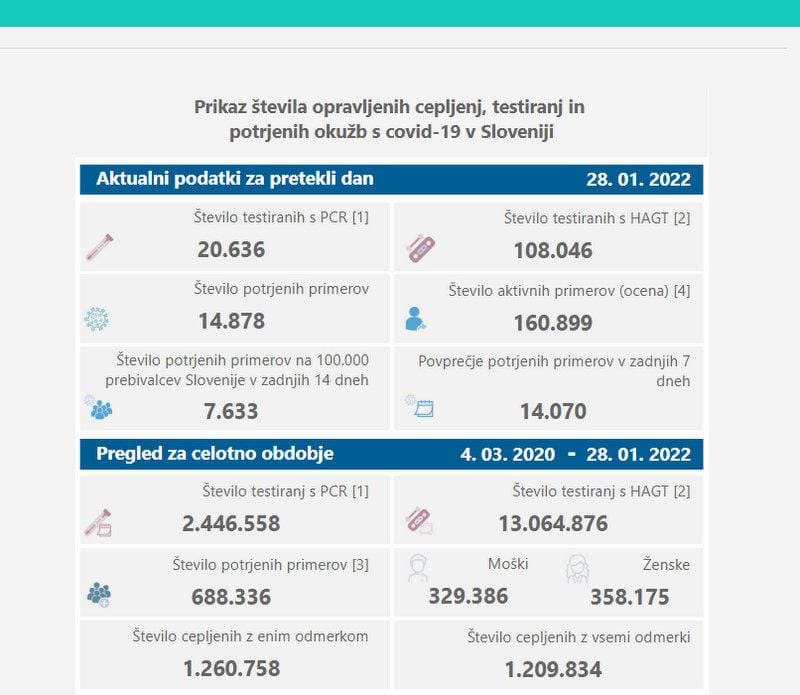 V petek so v Sloveniji ob opravljenih 20.636 PCR-testih potrdili 14.878 okužb z novim koronavirusom, dan pred tem so ob opravljenih 22.270 PCR-testih potrdili 16.571 okužb. Delež pozitivnih PCR-testov je znašal 72,1 odstotka, dan pred tem je bil 74,4–odstoten. Včeraj so opravili tudi 108.046 hitrih testov, katerih pozitivne rezultate preverjajo še s PCR-testi, dan pred tem 93.007.