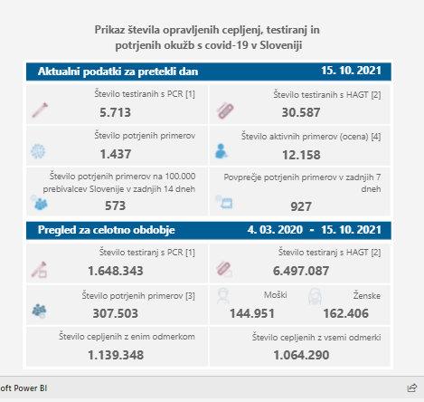 V petek so v Sloveniji opravili 5.713 PCR testov in z njimi potrdili 1.437 okužb z novim koronavirusom, dan pred tem so ob 5.139 PCR testih potrdili 1.100 novih okužb. Delež pozitivnih PCR testov je znašal 25,2 odstotka, dan pred tem 21,4 odstotka. Včeraj so sicer v državi opravili tudi 30.587 hitrih testov, ki jih v primeru pozitivnega izvida preverijo še s PCR-testi. Dan pred tem 20.942.