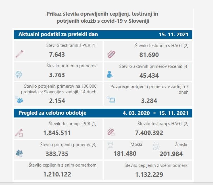 Po oceni NIJZ je trenutno v državi 45.434 aktivnih primerov okužb, dan pred tem 42.807 Sedemdnevno povprečje števila potrjenih primerov znaša 3284, dan prej 3224. Štirinajstdnevno povprečje števila potrjenih okužb na 100.000 prebivalcev pa je 2154, dan pred tem 2030.