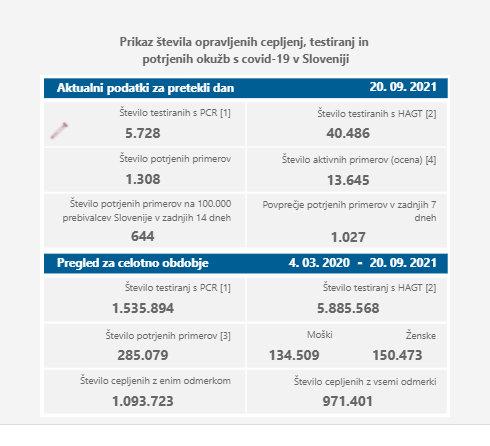 Sedemdnevno povprečje potrjenih primerov znaša 1,027, dan pred tem 1.039, 14-dnevna pojavnost na 100.000 prebivalcev 644 (dan pred tem 624). Po oceni NIJZ je v državi aktivnih okužb 13.645, dan pred tem 13.211.