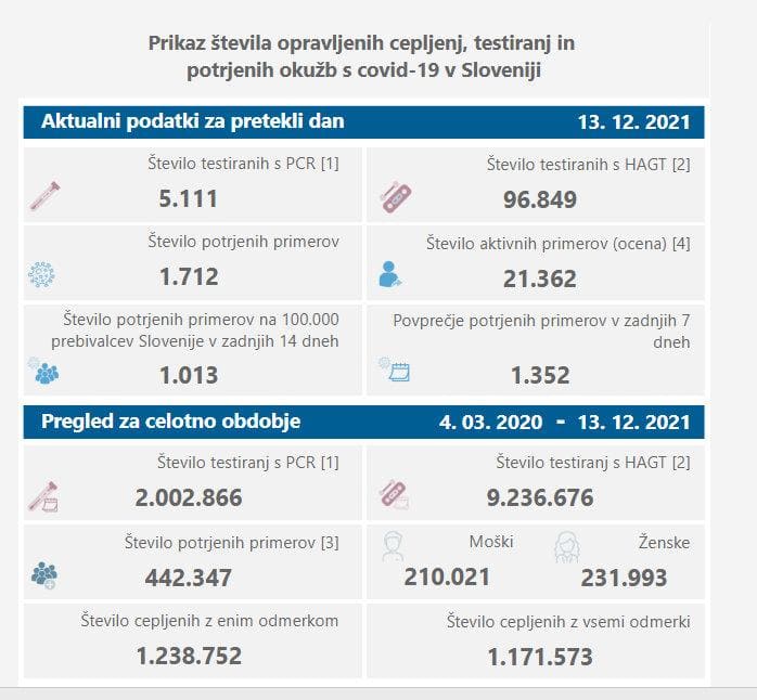 V ponedeljek so v Sloveniji ob 5111 PCR-testih potrdili 1712 okužb z novim koronavirusom, dan pred tem so ob 1749 PCR-testih potrdili 677 okužb. Delež pozitivnih PCR-testov znaša 33,5 odstotka, dan pred tem 38,7 odstotka. Opravili so tudi 96.849 hitrih antigenskih testov, katerih pozitivne rezultate potrjujejo še s PCR-testiranjem, dan pred tem 27.225.