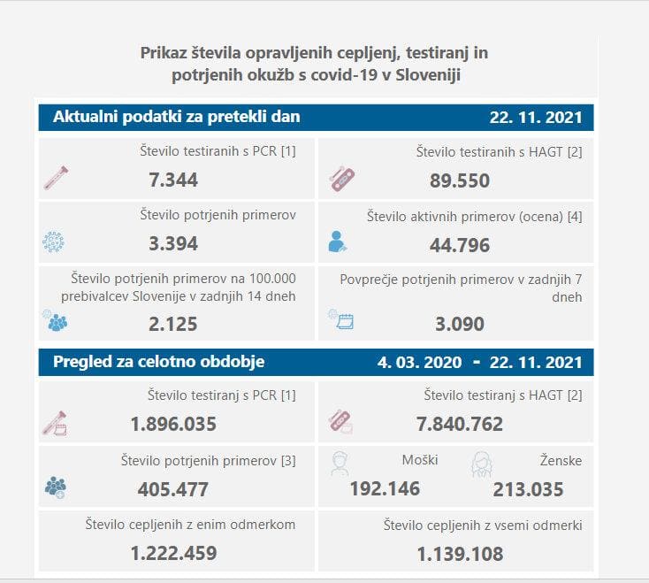 V ponedeljek so v Sloveniji ob 7344 PCR-testih potrdili 3394 okužb z novim koronavirusom, dan pred tem so ob 2730 PCR-testih potrdili 1389 okužb. Delež pozitivnih PCR-testov znaša 46,2 odstotka, dan pred tem 50,9 odstotka. Opravili so tudi 89.550 hitrih antigenskih testov, katerih pozitivne rezultate potrjujejo še s PCR-testiranjem, dan pred tem 19.956.