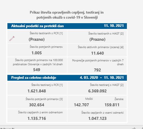 Pred tednom dni so v Sloveniji opravili 4.783 PCR-testov in z njimi potrdili 979 okužb z novim koronavirusom. Delež pozitivnih testov je tako znašal 20,5 odstotka. V bolnišnicah so zdravili 426 covidnih bolnikov, intenzivno zdravljenje jih je potrebovalo 113 oseb. Umrlo je osem bolnikov s covidom-19.
