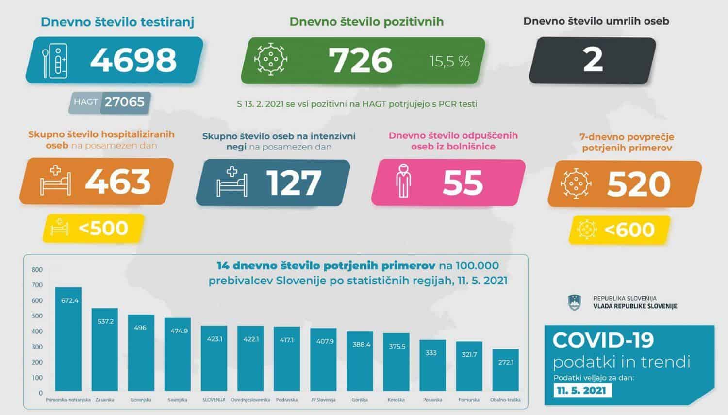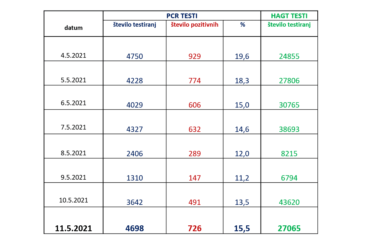 Vladna govorka Maja Bratuša je pojasnila, da je bilo včeraj opravljenih 4.698 PCR testov in 27.065 hitrih antigenskih testov. S PCR testi je bilo potrjenih 726.
