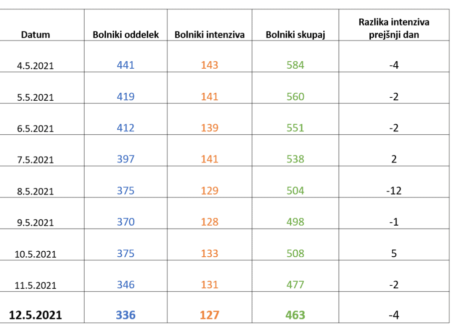 Danes se skupaj v bolnišnicah zdravi 463 pacientov, včeraj 477 pacientov. Podrobnejši pregled razmer v naših bolnišnicah pokaže, da je bilo včeraj v bolnišnice sprejetih 43 pacientov, iz bolnišnic pa je bilo včeraj skupaj odpuščenih 55 pacientov. Umrla sta covidna bolnika.